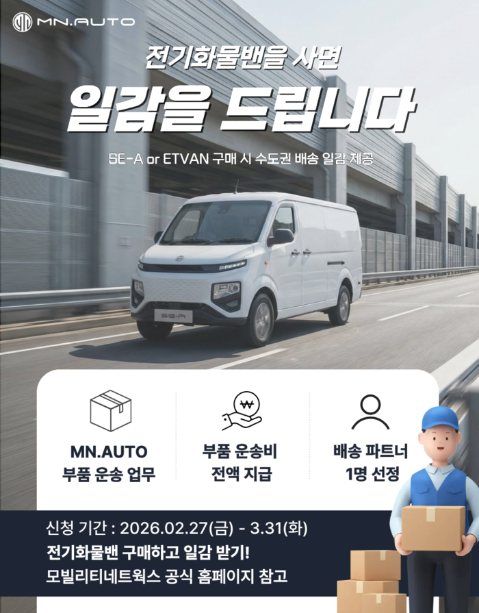 지원 자격은 ▲2026년 3월 모빌리티네트웍스 신차(힘찬쎄아밴, 이티밴) 구매 예정자 ▲수도권(서울·경기·인천) 거주 또는 주 활동지 ▲평일 주간 배송 가능 ▲주 1회 기록 제출 가능자다. 신청은 네이버폼을 통해 접수하며, 서류 검토 후 간단한 인터뷰를 거쳐 최종 1명을 선발한다.