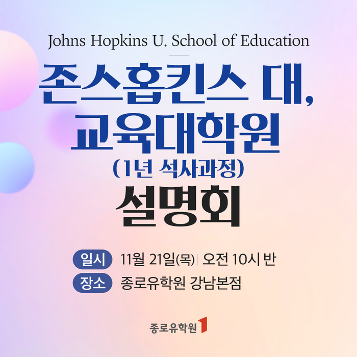 [메가경제=양대선 기자] 유학전문기업 종로유학원이 미국 존스홉킨스대, 교육대학원 설명회를 오는 11월21일 목요일 종로유학원 강남본점에서 진행할 예정이다. 본 설명회는 미국 내 교육분야 대학원 관심자, 교육/학원계에 재직하고 커리어 업그레이드를 원하는 분, 교육 관련 인턴십 혹은 현장 경험 원하는 분과 학부 전공 무관하게 교육대학원 원할 경우 모두 참여가 가능하다.