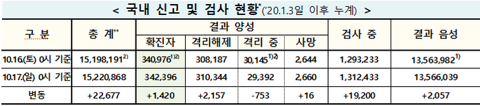 전날 하루 정규 선별진료소 의심환자 검사 건수는 2만2677건으로 직전일 4만5667건보다 2만2990건이 적다. 누적 선별진료소 진단검사 건수는 총 1522만868건이다. 선별진료소 기준 국내 누적 양성률(검사건수 대비 확진자수)은 2.25%를 보였다.