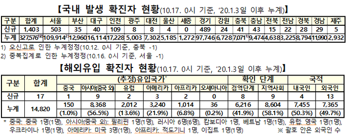 ▲ 17일 0시 기준 코로나19 국내발생(지역발생) 및 해외유입 확진자 현황. [질병관리청 제공] |