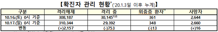 ▲ 17일 0시 기준 코로나19 확진자 관리 현황. [질병관리청 제공] |