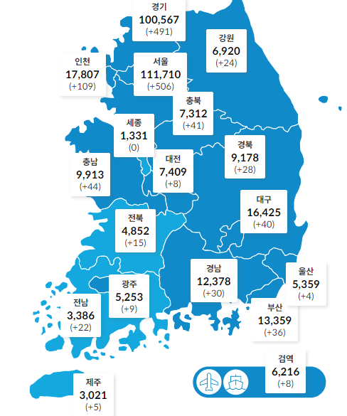 지역발생 확진자에다 해외유입 중 지역사회에서 자가격리중 양성판정을 받은 확진자를 합친 시도별 현황을 보면, 서울 506명, 경기 491명, 인천 109명, 충남 44명, 충북 41명, 대구 40명, 부산 36명 등이다.