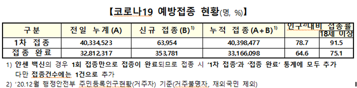 이로써 누적 1차 접종자는 4039만8477명으로 전국민 대비 78.7%의 접종률을 보였고, 18세 이상 1차 접종률은 91.5%를 기록했다.