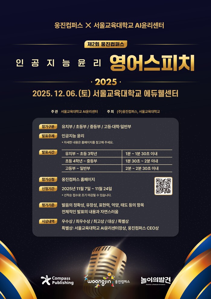 [메가경제=심영범 기자]웅진컴퍼스가 오는 12월 6일 서울교육대학교 에듀웰센터에서 '제2회 웅진컴퍼스 인공지능 윤리 영어스피치 2025'를 개최한다고 18일 밝혔다.