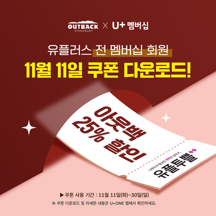 이번 프로모션은 LG유플러스 멤버십 VIP, VVIP, 우수 등급 고객이 아웃백의 연말 신메뉴 등 다양한 메뉴를 풍성한 혜택과 함께 즐길 수 있도록 기획됐다. 11일 하루동안 쿠폰을 발급받을 수 있으며, 30일까지 3주간 아웃백에서 25% 할인 혜택을 받을 수 있다.