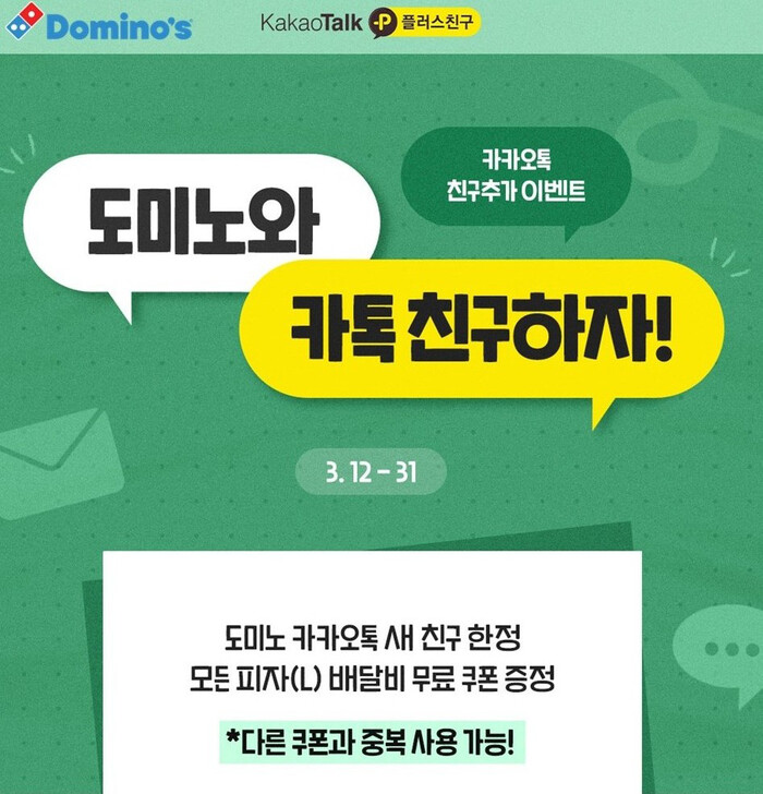 도미노피자는 자사 애플리케이션 회원 가운데 카카오톡에서 도미노피자를 새롭게 친구로 추가한 고객에게 모든 피자 L사이즈 주문 시 사용할 수 있는 배달비 무료 쿠폰을 제공한다고 12일 밝혔다. 이번 이벤트는 오는 31일까지 진행된다.