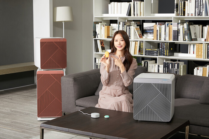 ▲ 삼성전자 모델이 수원 삼성전자 디지털시티 프리미엄하우스에서 삼성 공기청정기 '비스포크 큐브 에어'와 카카오엔터프라이즈 스마트 스피커 '미니헥사', '미니링크' 등을 소개하고 있다. [사진=삼성전자 제공] |