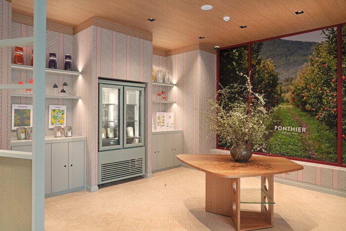매장 입구에는 작가 JENPJENP과 협업한 자수 아트워크를 설치해 브랜드 정체성을 강조했다. 우드 소재에 민트와 레드를 포인트 컬러로 적용해 해외 마켓과 카페를 동시에 경험하는 듯한 공간을 구현했다.