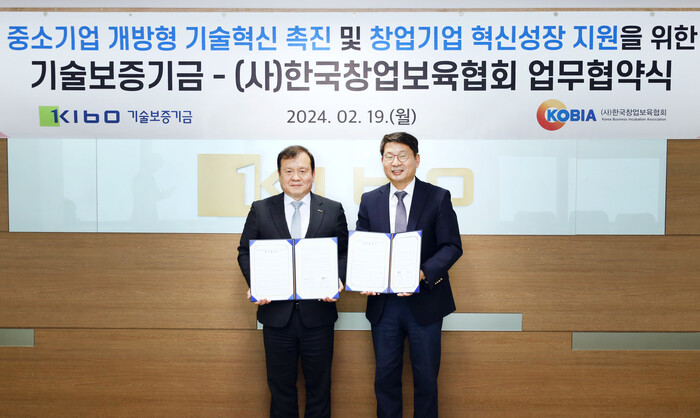 [메가경제=오민아 기자] 기술보증기금(이사장 김종호, 이하 ‘기보’)은 (사)한국창업보육협회(협회장 이광근 이하 ‘KOBIA’)와 19일(월) 기보 서울사무소에서 '중소기업 개방형 기술혁신 촉진 및 우수 창업기업 혁신성장 지원을 위한 업무협약'을 체결했다고 밝혔다.