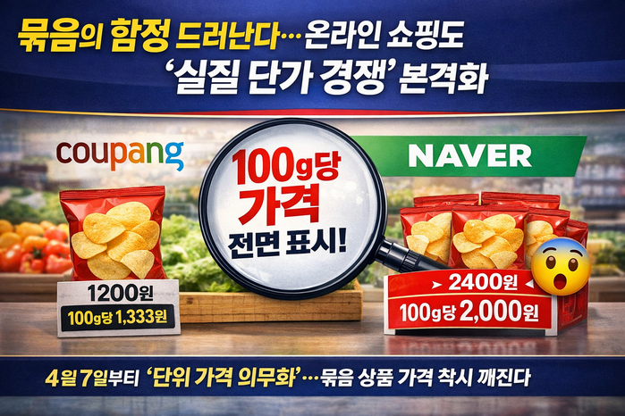[메가경제=주영래 기자] 앞으로 쿠팡과 네이버의 쇼핑 플랫폼에서 상품을 구매할 때 ‘100g당 얼마’와 같은 단위가격이 함께 표시된다. 낱개 상품과 묶음 상품 간 실제 가격 경쟁력을 한눈에 비교할 수 있게 되면서, ‘묶음이 더 싸다’는 기존 인식이 흔들릴 전망이다.