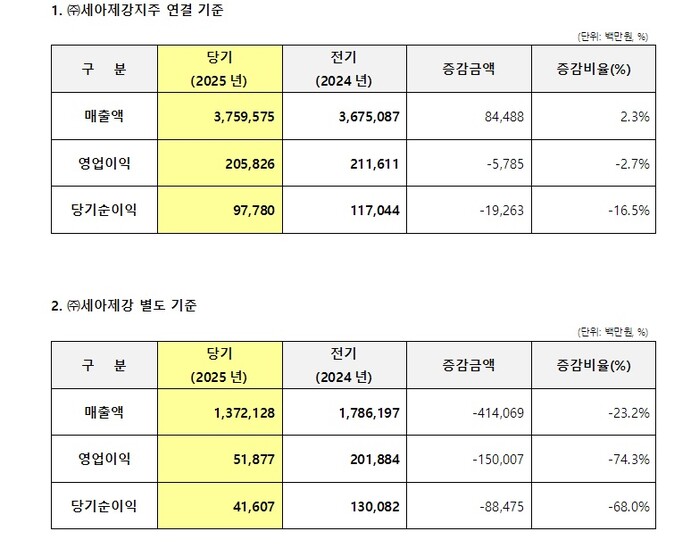 반면 국내 핵심 계열사인 세아제강은 철강 수요 위축과 글로벌 철강 시황 부진의 영향을 크게 받으며 수익성이 급격히 악화된 것으로 나타났다.