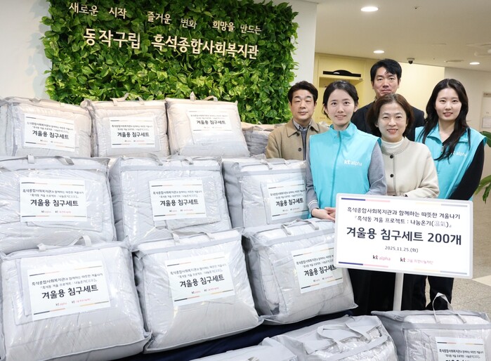 지난 25일 진행된 나눔행사는 KT알파 본사가 위치한 동작구 내 흑석종합사회복지관과 뜻을 모아 실시했다. 물품은 예년보다 이른 강추위가 예고된 올 겨울을 앞두고 도움이 필요한 지역 이웃들의 난방비 부담을 덜고 다가오는 추위에 대비할 수 있도록 방한용품인 겨울용 이불·베개 및 패드 세트로 선정했다.
