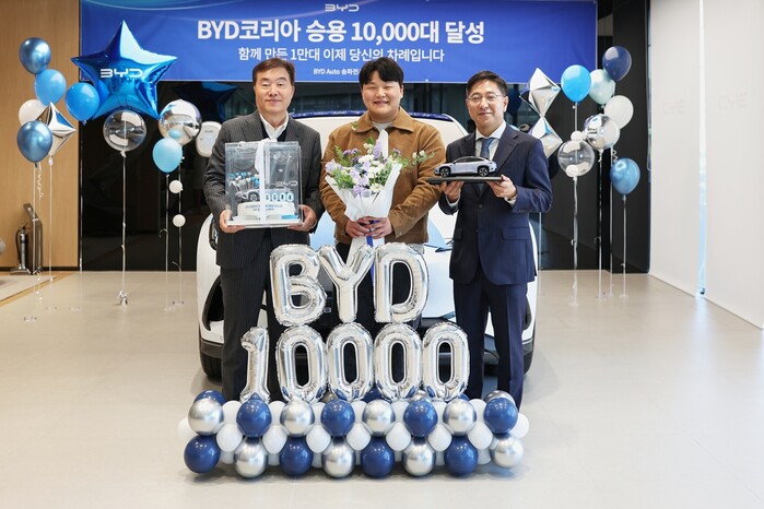 | ▲ 삼천리EV 손원현 대표(왼쪽)와 BYD코리아 조인철 대표(오른쪽)가 1만번째 고객인 김진서씨를 축하하고 있다 [사진=BYD] |