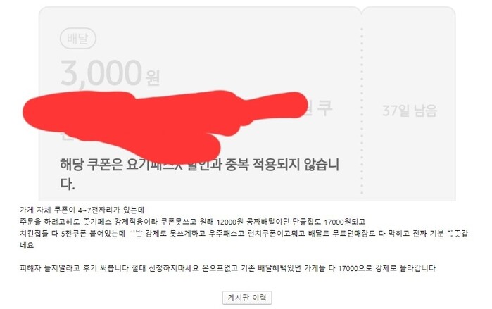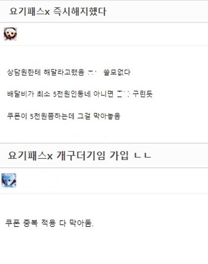 게시물을 올린 한 이용자는 "주문하려 해도 요기패스 강제 적용이라 쿠폰 못 쓰고 원래 1만 2000원 공짜 배달이던 단골집도 1만 7000원 된다"고 주장했다. 또 다른 이용자는 게시물을 통해 "쿠폰 중복 적용을 다 막아뒀다"고 꼬집었다.