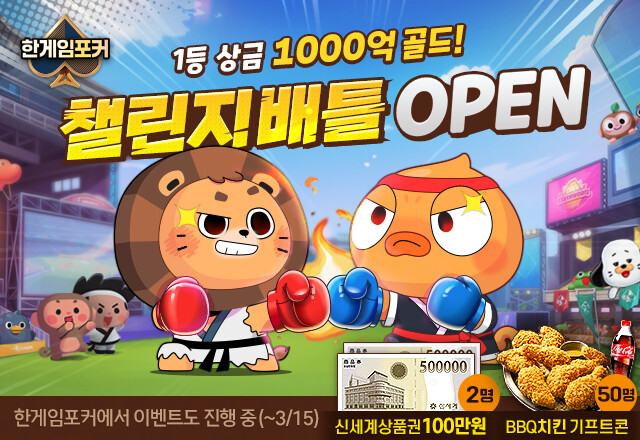 ‘챌린지배틀’은 한게임포커의 대표 캐릭터인 ‘한게임포커 프렌즈’를 활용해 제작된 이벤트성 도전 콘텐츠다. 다섯 가지 챌린지가 제공되며, 참가자는 다른 참가자들과 경쟁하여 결과에 따라 보상을 받을 수 있다. 각 챌린지 종료 후 순위에 따라 랜덤 박스를 지급하는 결과 보상과 전체 순위 상금 두 종류의 보상을 제공하는데, 전체 1위를 기록하는 이용자는 게임머니 1,000억 골드를 획득할 수 있다. ‘챌린지배틀’은 격주에 한번 4일간 진행되며, 첫번째 회차는 2월 25일부터 28일까지 진행 중이다.