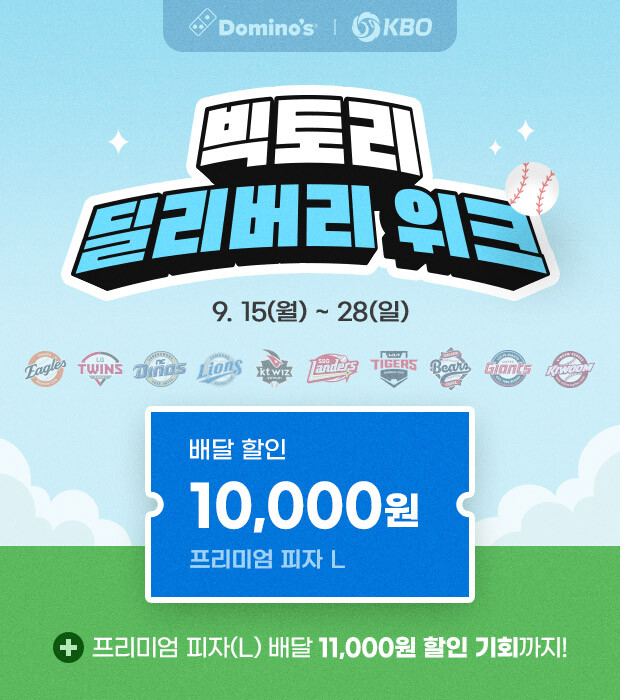 도미노피자의 ‘빅토리 딜리버리 위크’는 배달 프로모션으로 자사앱 로그인 후 이벤트 페이지에서 좋아하는 프로야구 응원팀을 선택하면 오는 28일까지 사용 가능한 프리미엄피자(L) 배달 1만원 할인쿠폰을 지급한다.