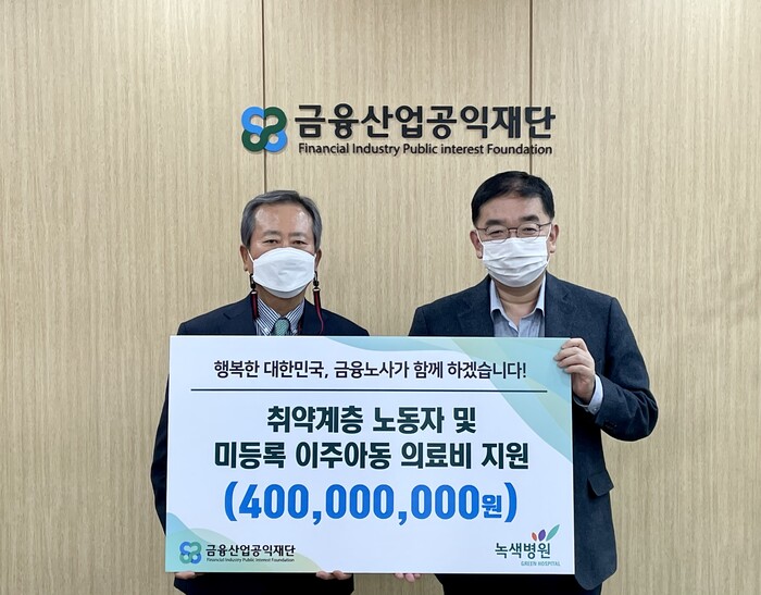 금융산업공익재단(대표이사장 신상훈)이 3일 원진재단 부설 녹색병원과 함께 취약계층 노동자 및 미등록 이주아동에게 연 4억원의 의료비를 지원하는 업무 협약식을 가졌다.