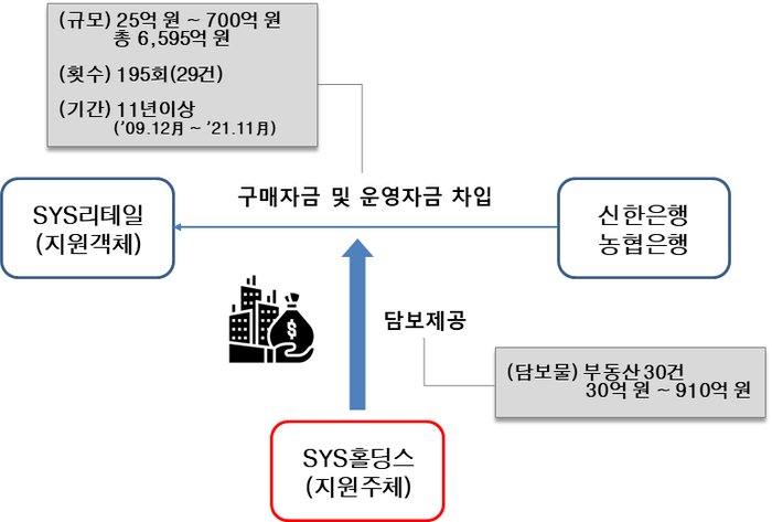 이를 수락한 SYS홀딩스는 지난 2020년 기준 공시가로 3616억 5700만원 상당의 부동산 자산 30건을 담보로 무상 제공했고 신한은행은 SYS리테일에 500억원을 빌려줬다.