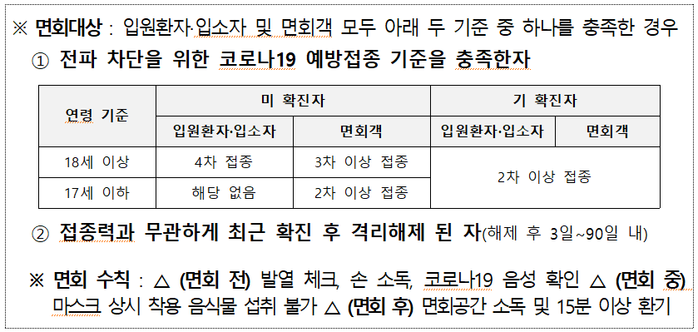 이미 확진된 적이 있는 사람은 입원환자·입소자, 면회객 모두 2차 이상 접종을 받으면 면회가 가능하다.