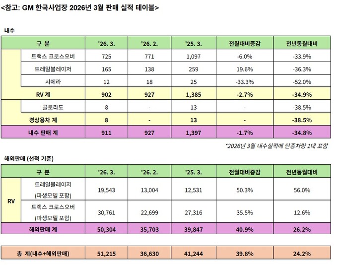 이 중 SUV인 쉐보레 트랙스 크로스오버(파생모델 포함)와 쉐보레 트레일블레이저(파생모델 포함)가 전년 동월 대비 각각 12.6%, 56% 증가한 3만761대와 1만9543대 판매됐다.