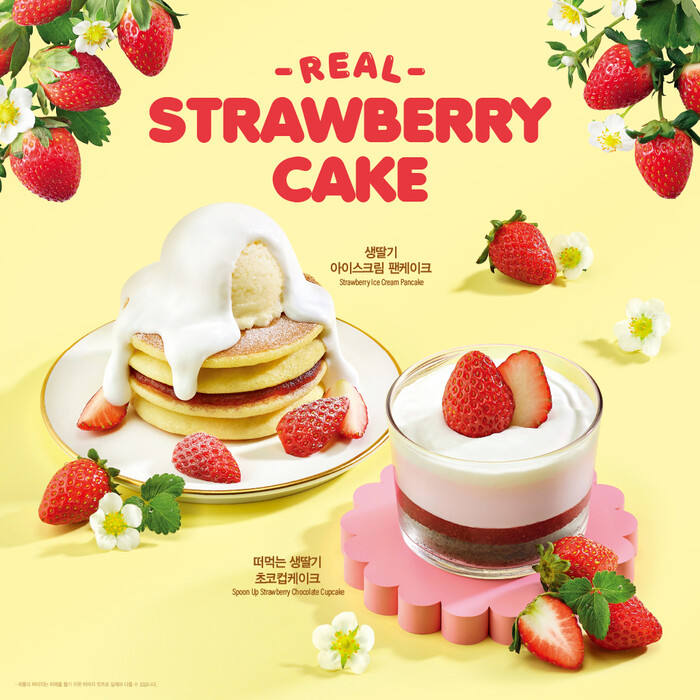 ‘생딸기 아이스크림 팬케이크’는 팬케이크 위에 딸기 시럽과 바닐라 아이스크림, 플로팅 크림을 더한 메뉴다. 따뜻함과 차가운 식감이 조화를 이룬다. ‘떠먹는 생딸기 초코컵케이크’는 초코 시트에 딸기잼과 딸기맛 크림, 플로팅 크림을 층층이 구성해 달콤함과 상큼함을 동시에 살렸다.