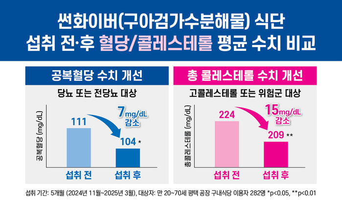 평소 구내식당에서 제공하던 식단은 그대로 유지하되 밥을 지을 때 '썬화이버'만 추가하였는데, 프로젝트 전후 건강검진 결과를 비교 분석한 결과, 참가자들의 건강 지표는 뚜렷하게 개선되었다. 프로젝트 참여 전과 비교해 공복혈당이 100mg/dL 이상인 전당뇨·당뇨군의 혈당 평균 수치는 7mg/dL 감소했으며, 총 콜레스테롤이 200mg/dL 이상인 고콜레스테롤 위험군의 콜레스테롤 평균 수치는 15mg/dL 내려가는 긍정적인 변화를 보였다.