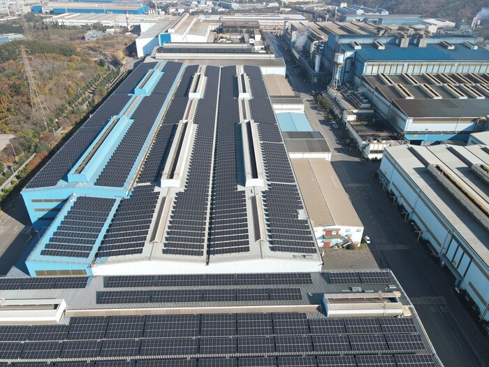 ▲ 동국제강 포항공장 지붕에 설치된 태양광 자가발전 설비 [사진=동국제강 제공] |