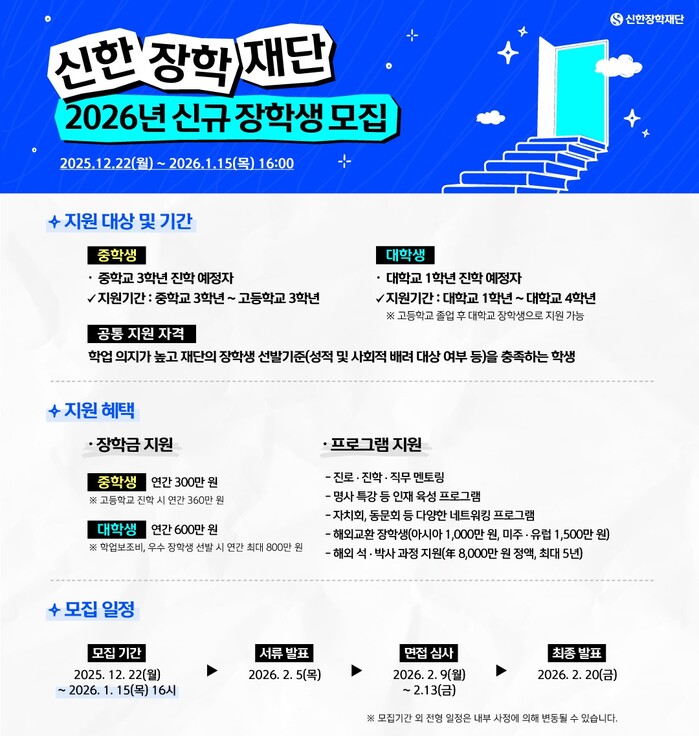 [메가경제=이상원 기자] 신한장학재단은 2026학년도 중학교 3학년 진학 예정자 및 대학 입학 예정자를 대상으로 신규 장학생을 모집한다고 22일 밝혔다.