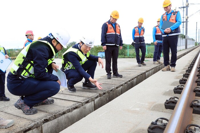 [메가경제=문기환 기자] 이성해 국가철도공단 이사장은 지난 14일 호남고속철도 신작교~어량교 구간의 노반침하 하자보수 현장 점검에 나섰다.
