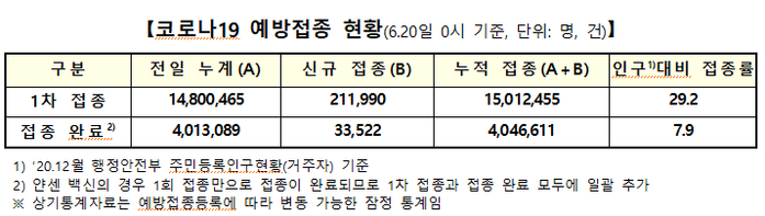 이에 따라 누적 1차 접종자는 1501만2455명으로 늘었다. 이는 작년 12월 기준 인구(5134만9116명) 대비 29.2% 수준이다.