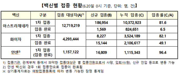 전날 하루 코로나19 신규 1차 접종자는 아스트라제네카 18만6954명, 화이자 8227명, 얀센 1만6809명이었다.