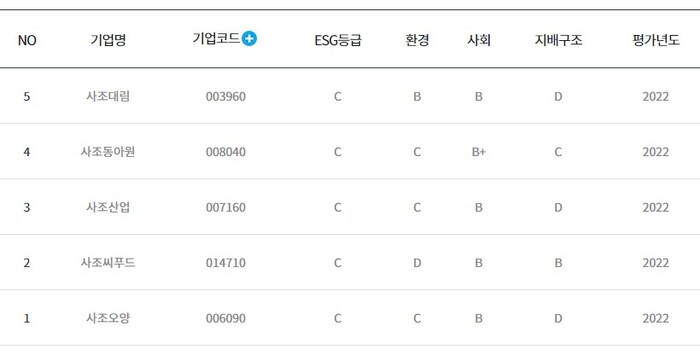 한국ESG기준원(KCGS)의 지난해 ESG 등급 부여 현황에 따르면 사조대림과 사조동아원, 사조산업, 사조씨푸드, 사조오양 등 상장 계열사 5곳은 모두 ESG 통합등급 'C'로 평가받았다. 이는 보통 수준인 B등급보다 낮은 기록이다.