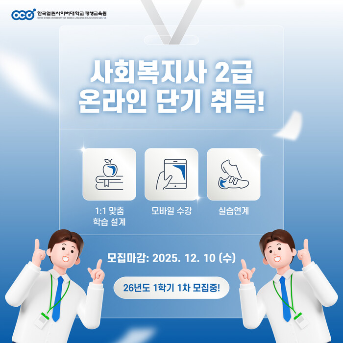 [메가경제=전창민 기자] 한국열린사이버대학교 평생교육원이 12월 10일(수)까지 2025년 마지막 사회복지사 2급 수강생을 모집한다. 오는 12월 11일(목) 개강 예정으로, 비교적 단기간 안에 교육 과정을 마치고 2026년 사회복지 분야 취업에 도전할 수 있다는 점에서 관심이 높다.