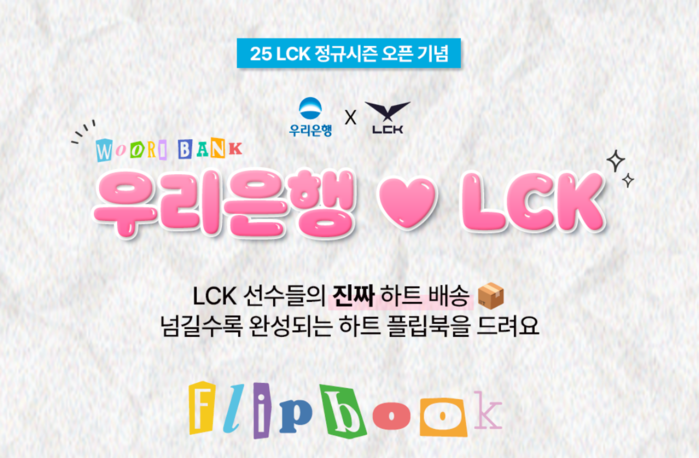 [메가경제=문혜원 기자] 우리은행(은행장 정진완)이 국내 대표 e스포츠 리그인 ‘리그 오브 레전드 챔피언스 코리아(LCK)’팬들을 위해‘우리은행 ♡ LCK’ 이벤트를 진행한다고 27일 밝혔다.
