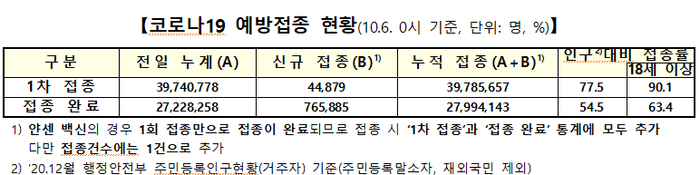 코로나19 예방접종 대응 추진단에 따르면, 6일 0시 기준으로 전날 대비 4만4879명이 새롭게 1차 접종에 참여, 누적 1차 접종자는 3978만5657명으로 전국민 대비 접종률은 77.5%로 높아졌다.