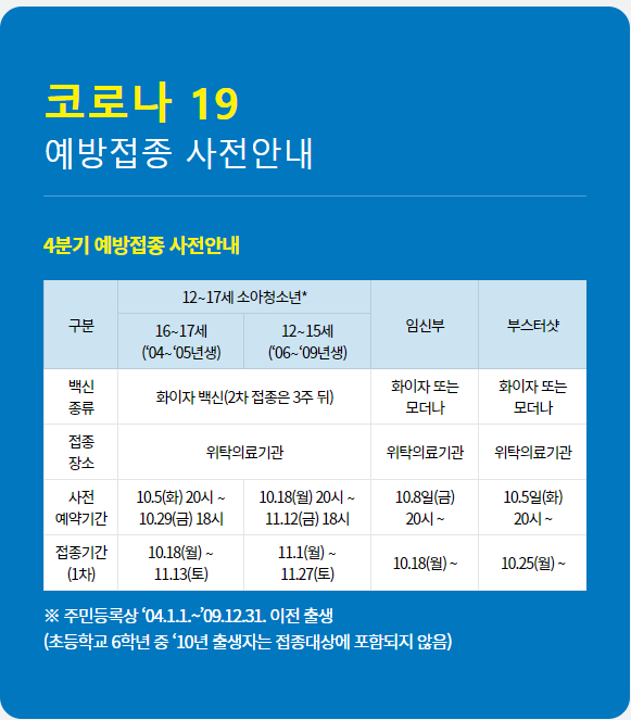 이들은 2004~2005년생이 대상으로, 사전예약은 이달 29일 금요일 오후 6시까지 약 4주 간 실시되며, 접종은 이달 18일부터 내달 13일까지 전국 위탁의료기관에서 화이자 백신으로 시행한다.