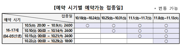 ▲ 16~17세 예약 시기별 예약가능 접종일. [질병관리청 제공] |