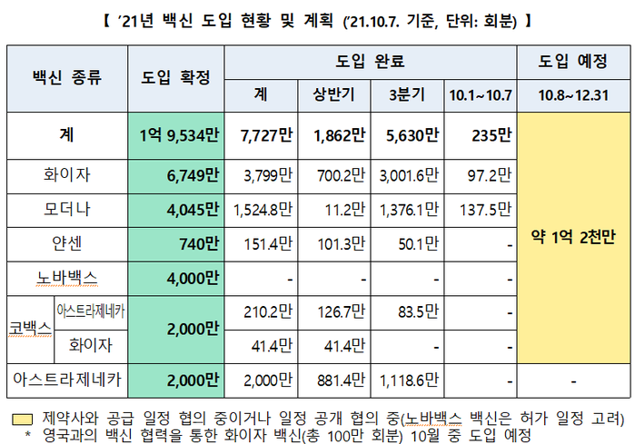 이로써 7일 기준 누적 7727만 회분의 코로나19 백신이 국내에 공급된다.
