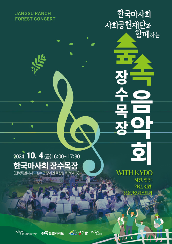 [메가경제=주영래 기자] 한국마사회(회장 정기환)는 전북특별자치도 출범 후 발전을 기원하는 농어촌 청소년 오케스트라 숲속 야외 음악회를 오는 10월 4일(금) 장수목장에서 개최한다고 밝혔다.