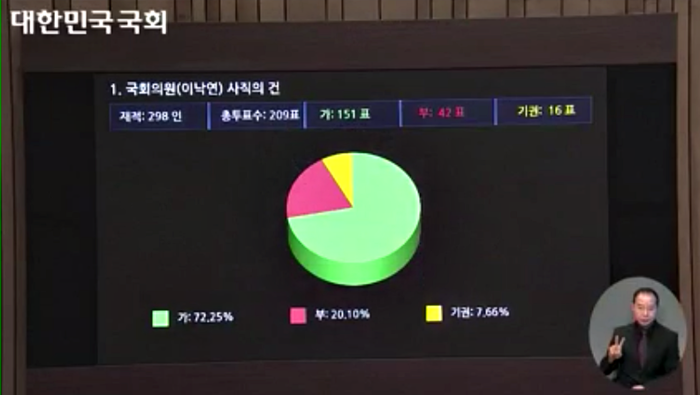 국회는 15일 오후 본회의에서 이 전 대표의 사직안을 투표에 부쳐 총 투표수 209표 중 찬성 151표, 반대 42표, 기권 16표로 가결정족수를 넘겼다.