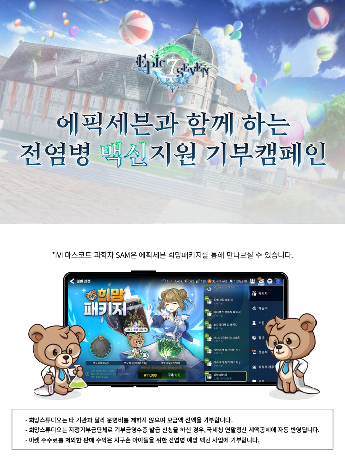 스마일게이트 산하 희망스튜디오는 국제백신연구소(IVI)와 함께 게임 ‘에픽세븐’ 연계 전염병 백신 지원 기부 활동을 실시한다고 6일 밝혔다.