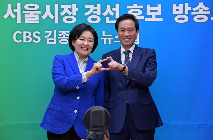 ▲ 24일 오후 서울 목동 CBS 스튜디오에서 열린 더불어민주당 서울시장 경선 후보 방송토론회에서 박영선(왼쪽), 우상호 후보가 기념 촬영을 하고 있다. [국회사진기자단] |