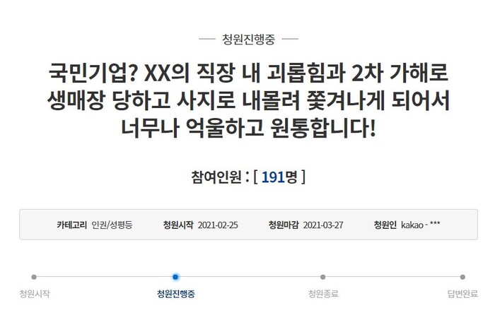 2일 청와대 국민청원 게시판에는 "국민기업? XX의 직장 내 괴롭힘과 2차 가해로 생매장 당하고 사지로 내몰려 쫓겨나게 되어서 너무나 억울하고 원통합니다!"라는 제목으로 지난달 25일부터 청원이 진행 중이다. 본지 취재 결과, 청원 대상 기업은 KT인 것으로 확인됐다.