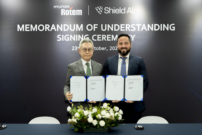 | ▲이정엽 현대로템 부사장(왼쪽)과 마이크 한린 쉴드AI 글로벌 전략 및 사업개발 총괄이 지난 23일 경기 고양시 킨텍스(KINTEX)에서 열린 ‘2025 서울 국제 항공우주 및 방위산업 전시회(ADEX)’에서 ‘국방 AI 기반 다목적 드론 운용 기술 개발을 위한 업무협약’을 체결한 후 기념촬영을 하고 있다. |