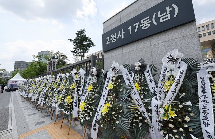 | ▲ 행정안전부 내 경찰국 신설을 위한 '행정안전부와 그 소속기관 직제 일부개정령안'이 국무회의를 통과한 26일 정부세종청사 행정안전부 앞에 경찰국 신설 반대 메시지가 적힌 근조 화환들이 놓여 있다. [세종=연합뉴스] |