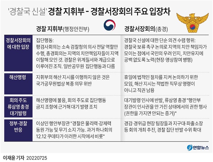 | ▲ 경찰국 신설안에 대한 경찰 지휘부와 경찰서장회의 주요 입장차. [그래픽=연합뉴스] |