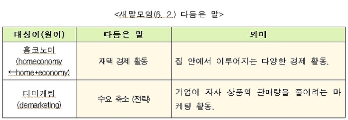 문체부와 국어원은 ‘홈코노미’처럼 어려운 용어 때문에 국민이 정보에서 소외되지 않도록 ‘재택 경제 활동’과 같이 쉬운 말로 발 빠르게 다듬고 있다.
