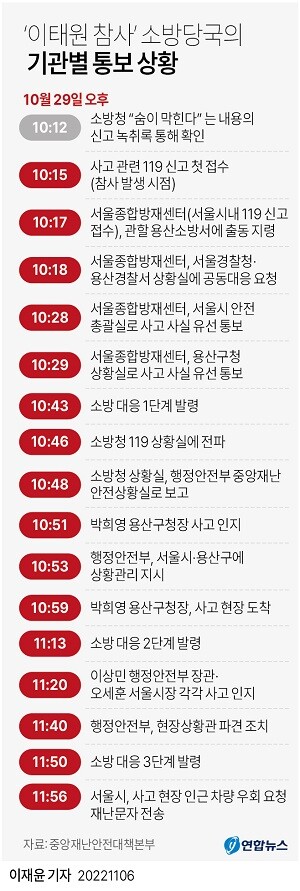 | ▲ '이태원 참사' 소방당국의 기관별 통보 상황. [그래픽=연합뉴스] |