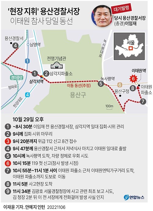 | ▲ '이태원 참사' 당시 현장 총괄 책임자였던 이임재 전 용산경찰서장의 당일 동선. [그래픽=연합뉴스] |