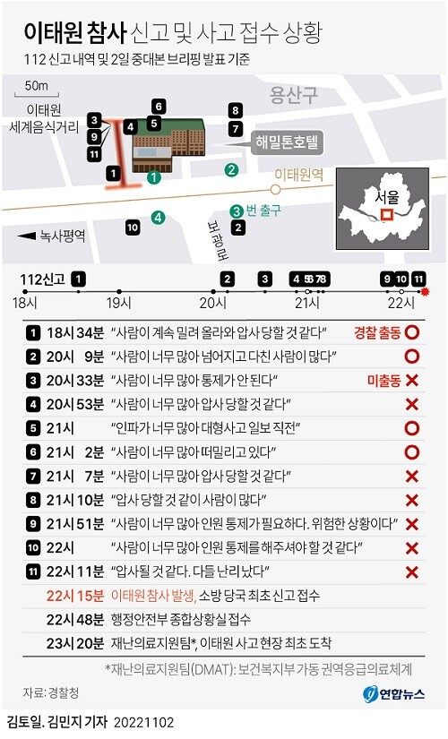 | ▲ 이태원 참사 신고 및 사고 접수 상황. [그래픽=연합뉴스] |